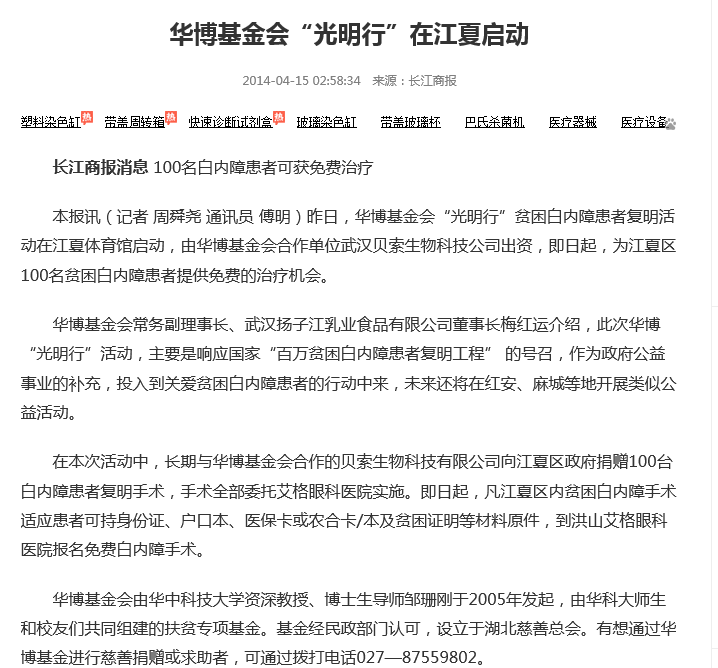 2014年4月14日,我公司派代表參加在武漢市江夏區(qū)舉行的“華博基金光明行”江夏區(qū)貧困白內(nèi)障患者復(fù)明手術(shù)啟動(dòng)儀式。