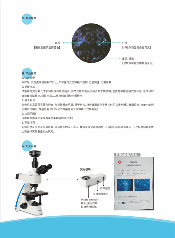 本試劑盒通過免疫學(xué)和熒光顯色原理,能快速檢測各類樣中存在的β-葡聚糖或幾丁質(zhì)成分。并依據(jù)其形態(tài)學(xué)特點,對被標(biāo)記的物質(zhì)進行鑒定分析。真菌細胞壁富含β-葡聚糖、幾丁質(zhì)等多糖, 因此更容易被標(biāo)記,通過熒光顯微鏡紫外(波長:340nm~380nm)激發(fā)靶點上的熒光素,鏡 下可觀察其形態(tài), 從而 定性檢 測真菌。