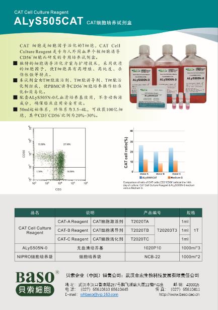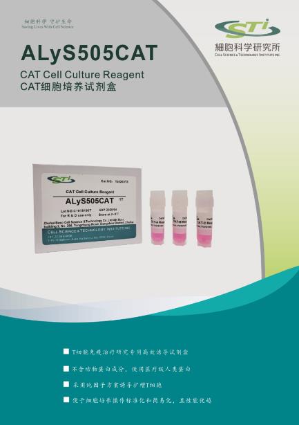 【產(chǎn)品概述】本產(chǎn)品是專為CAT(CIK)細(xì)胞高效活化誘導(dǎo)而研發(fā)的新一代CAT 細(xì)胞培養(yǎng)試劑盒,由CAT-A Reagent、CAT-B Reagent 和CAT-C Reagent 組成,含有優(yōu)質(zhì)級(jí)細(xì)胞因子及醫(yī)療級(jí)重組蛋白,不含動(dòng)物源成分,不含滋養(yǎng)層細(xì)胞,可高效誘導(dǎo)人外周血PBMC培養(yǎng)CAT 細(xì)胞。本試劑盒需配套AlyS505N-0 無血清培養(yǎng)基使用,可提高細(xì)胞增殖倍數(shù)、CAT 細(xì)胞純度和殺瘤活性,同時(shí)使CAT 細(xì)胞培養(yǎng)操作標(biāo)準(zhǔn)化和簡易化。