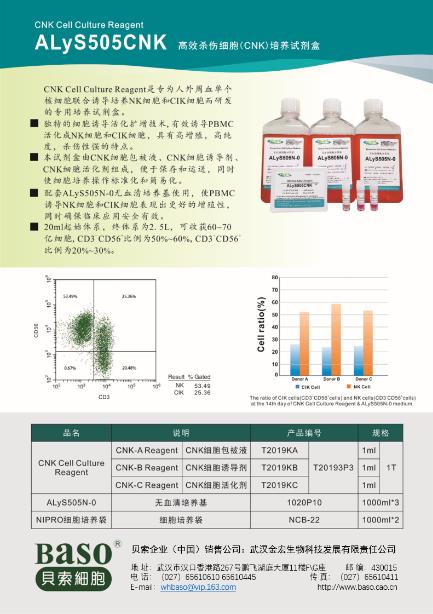 【產(chǎn)品概述】本產(chǎn)品是專為高效聯(lián)合誘導(dǎo)培養(yǎng)NK 與CIK 細(xì)胞而研發(fā)的細(xì)胞共培養(yǎng)試劑盒,由CNK-A Reagent、CNK-B Reagent 及CNK-C Reagent 組成,含有優(yōu)質(zhì)級細(xì)胞因子及醫(yī)療級重組蛋白,不含動(dòng)物源成分,可高效聯(lián)合誘導(dǎo)人外周血NK & CIK 細(xì)胞。本試劑盒需配套AlyS505N-0 無血清培養(yǎng)基使用,在同一培養(yǎng)體系同一培養(yǎng)周期內(nèi)可聯(lián)合培養(yǎng)NK 與CIK 兩種細(xì)胞,提高了細(xì)胞增殖倍數(shù)與殺瘤活性,同時(shí)使NK & CIK 細(xì)胞聯(lián)合培養(yǎng)操作標(biāo)準(zhǔn)化和簡易化。